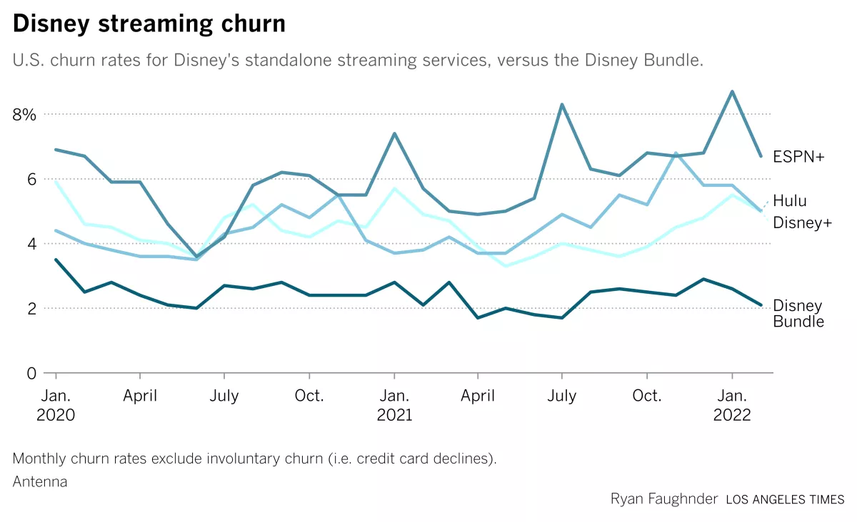 For example, this graph shows churn rates of Disney streaming products in the past 2 years. It shows the bundle product has the lowest churn rate, and the rate is quite stable over the 2-year's period.