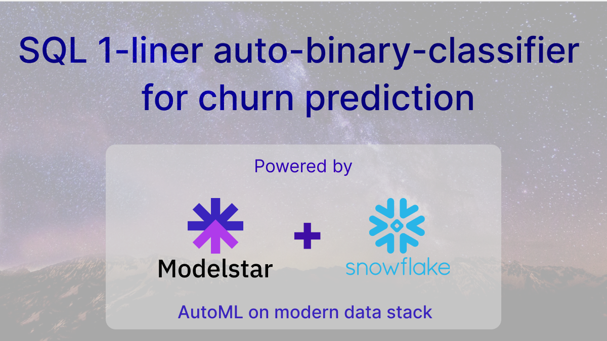 Modelstar provides an AutoML solution to enable SQL users to automatically obtain the best model trained from 12 ML algorithms. The 2 SQL commands train_binary_classifier (for model training) and predict_binary_classifier (for inference) automate the churn analysis process. They're developed based on our favorite open source Python AutoML library: PyCaret. It supports a large data scientist community (~7K GitHub Stars), and is widely used in industry (~1M downloads /month).