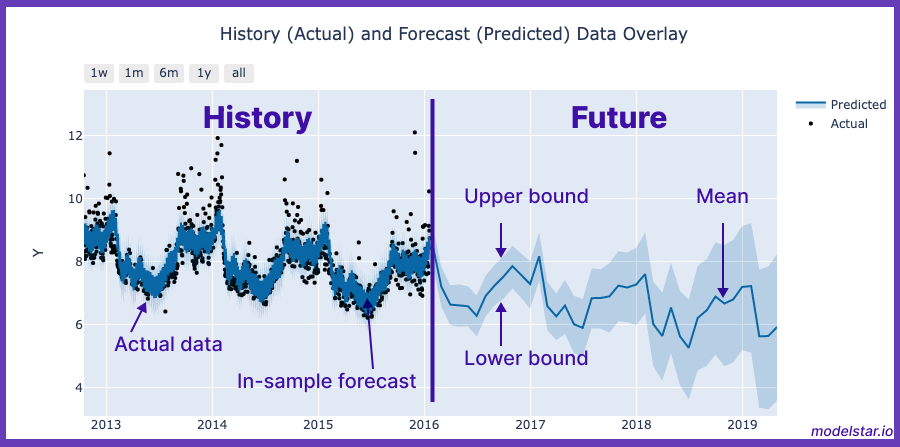 DS(datetime): timeY_FORECAST,YHAT_LOWER,YHAT_UPPER(float): mean, lower and upper bonds of the predicted value (seeUncertainty Intervalsin the Glossary section for their meaning).